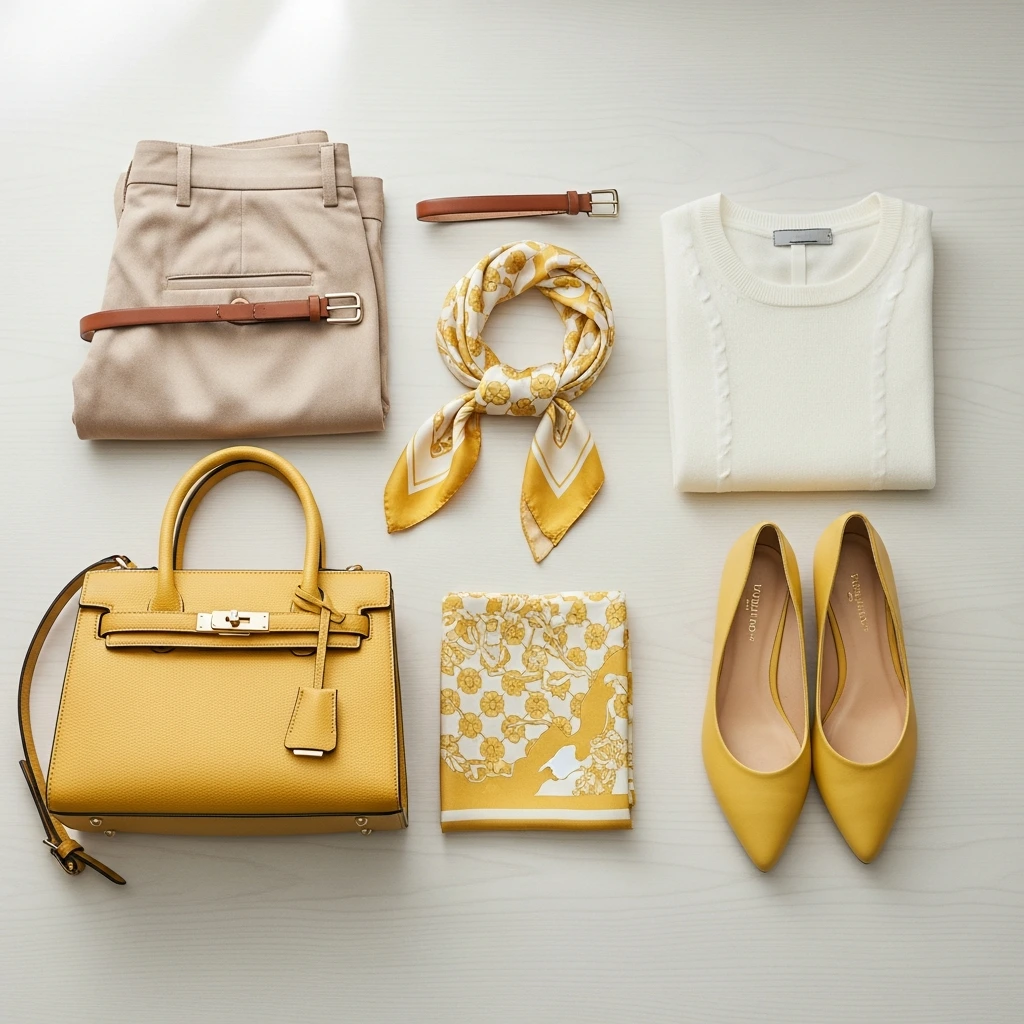 If wearing large expanses of butter yellow feels intimidating, incorporating the color through accessories offers a low-risk entry point. Butter yellow accessories inject personality and warmth into neutral outfits while remaining completely versatile.